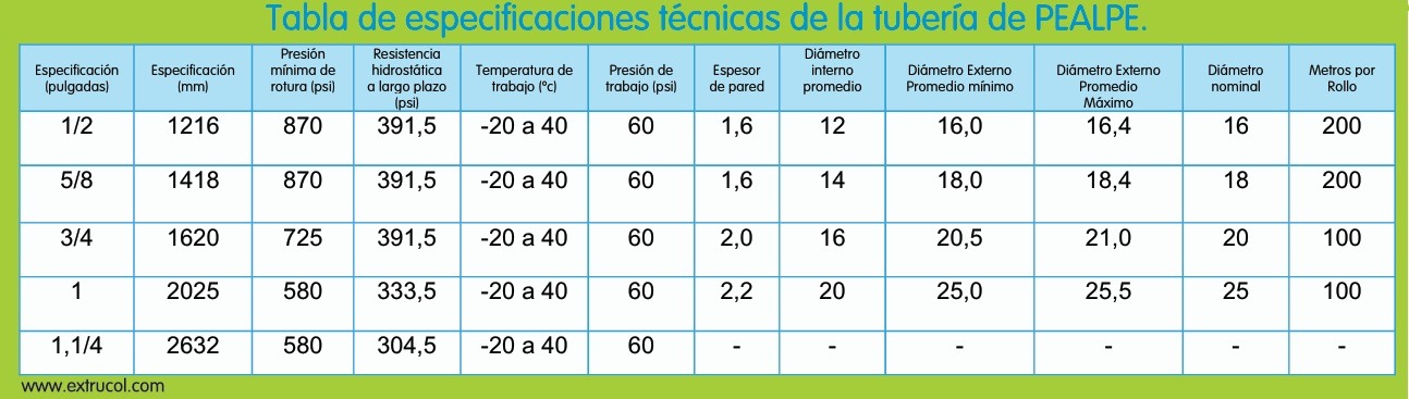 Los tubos macro-compuestos PE-AL-PE están diseñados para presión máxima de operación hasta 500 kPa (5 bar) a una temperatura de 0 ºC a 40 ºC.