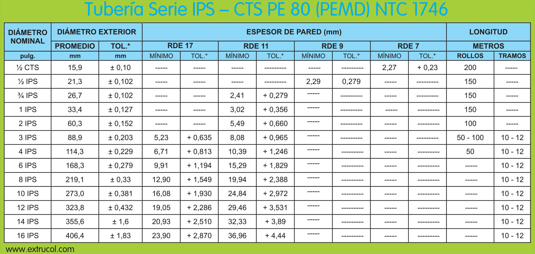 Las tuberías y accesorios para la conducción de combustibles gaseosos fabricados por Extrucol bajo las normas NTC1746 y UNE EN1555-2 en serie pulgadas y métrica, son obtenidos a partir del polietileno de media densidad (PEMD), grado PE2708 o PE 80 para presiones de trabajo hasta 60 psi y polietileno de alta densidad (PEAD), grado PE4710 o PE100 para una presión de trabajo hasta 145 psi.